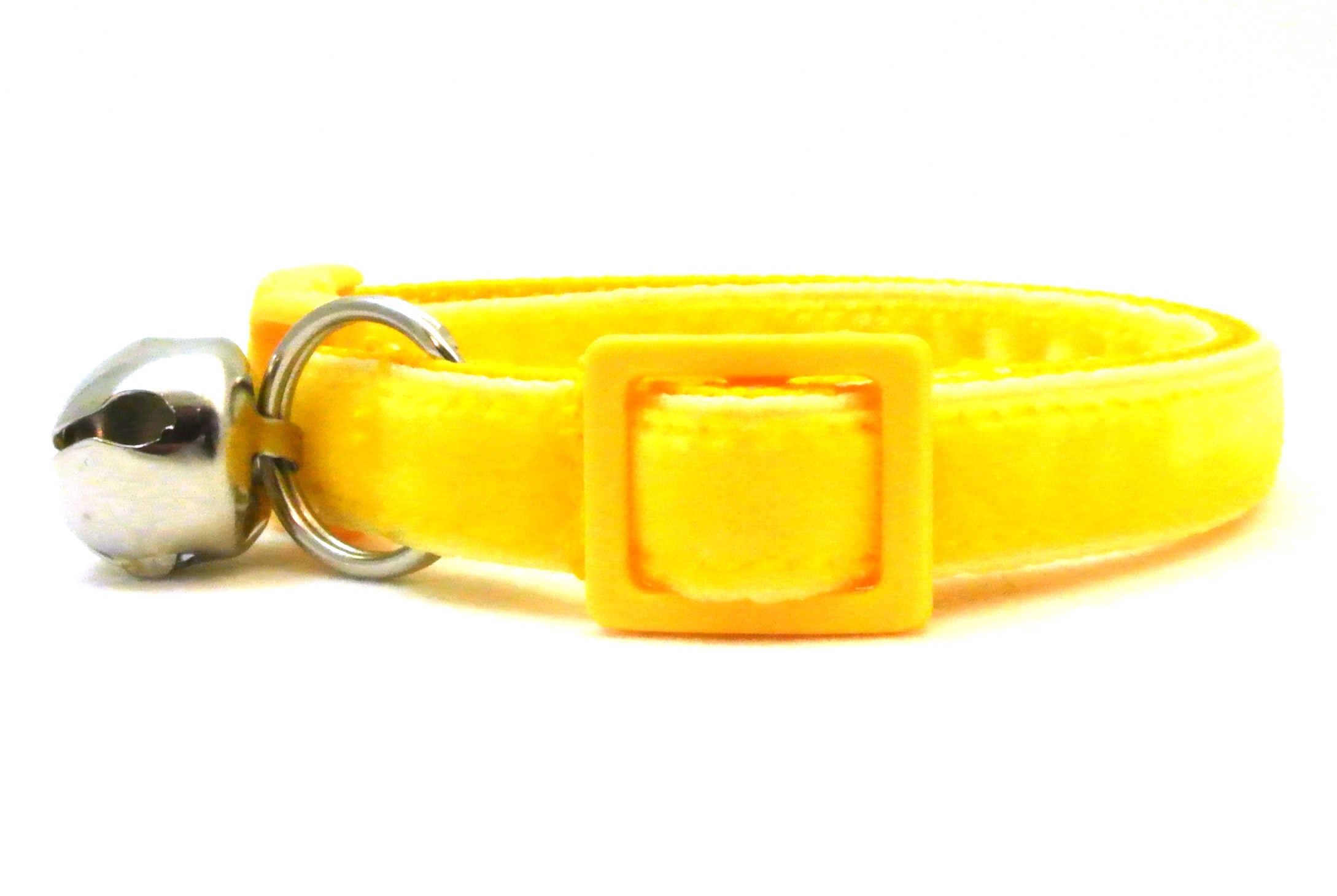 Give your cat a little style with this plush yellow velvet cat collar. This collar includes a breakaway buckle and jingle bell to thwart your kitty’s sidle attempts! (Bell is removable.)